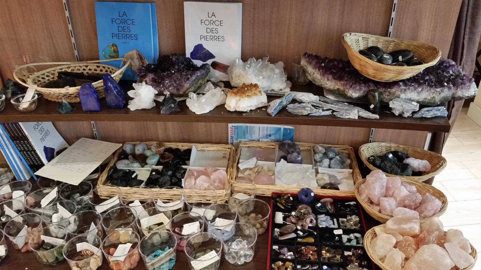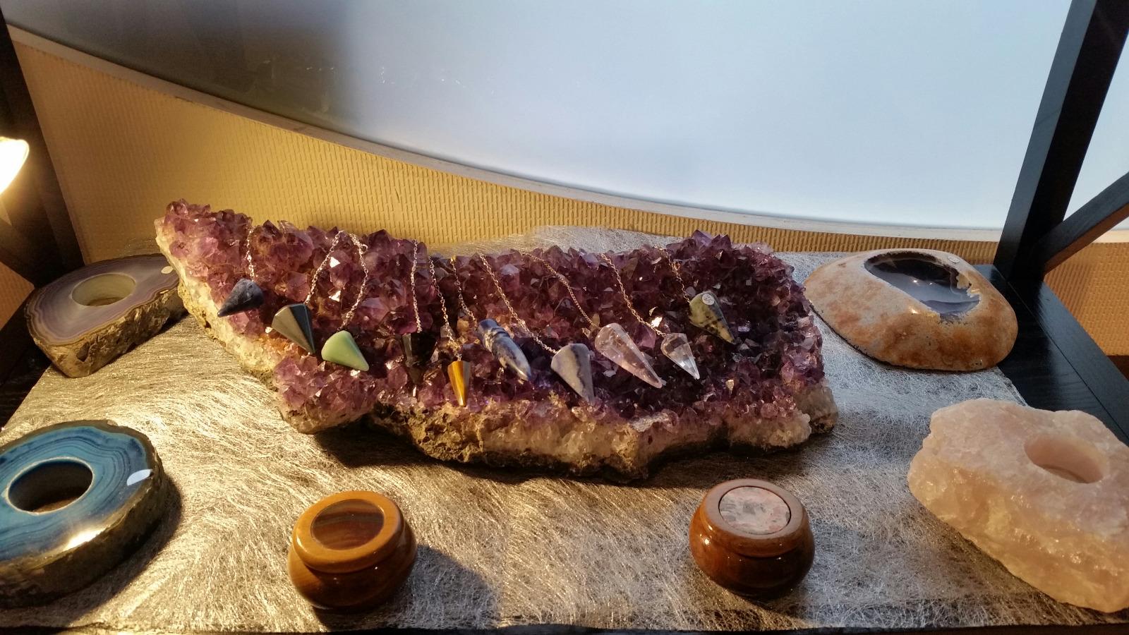 Cristaux : Pierres brutes et roulées, pendentifs, donuts, pendules, bracelets.