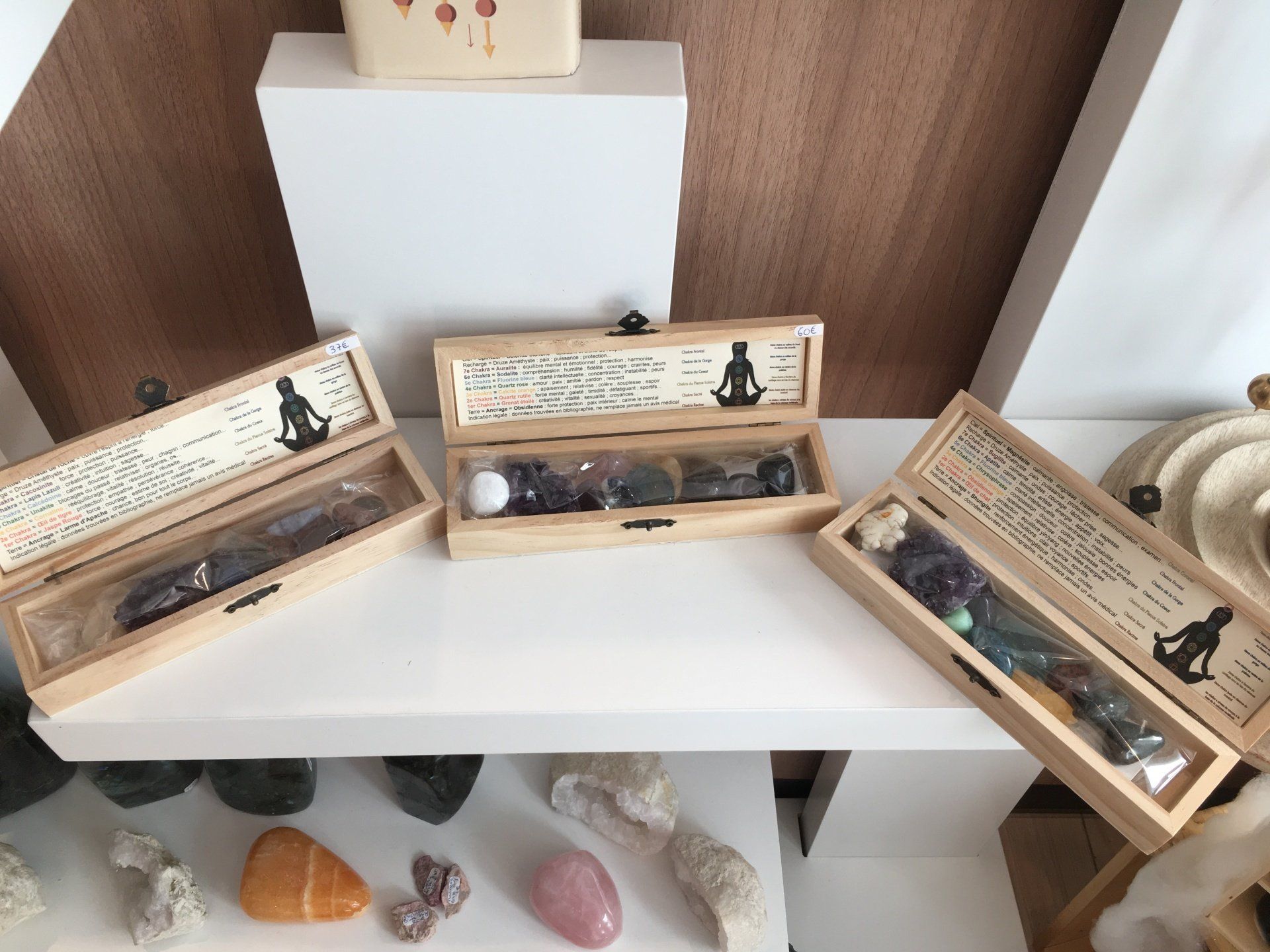 Et nos plumiers aux 10 pierres comprenant 1 pierre par couleur de Chakra (x7), 1 pierre noire d'ancrage, 1 pierre blanche de connexion, 1 bloc Amethyste brut de recharge. Plusieurs modèles et prix différents à partir de 37€.